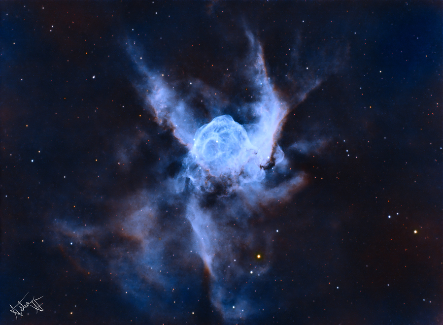 Thor's Helmet (NGC 2359) is an emission nebula located in the constellation Canis Major. It is about 11,960 light years from Earth and is 30 light-years across. The central star is the Wolf-Rayet star WR7, extremely hot and thought to be pre-supernova stage of evolution. Interactions with a nearby large molecular cloud are thought to have contributed to the more complex shape and curved bow-shock structure of Thor's Helmet. About this Image: 7h 50min Ha 5h 40min Oiii 7h 40min sii Total Integration 21h 10min